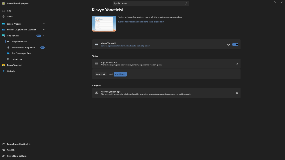 “Klavye Yöneticisi”ni aktif ettikten sonra ilgileneceğimiz kısım burası. “Tuşlar” alanından klavyenizin tuşlarının atamasını değiştirebilir, “Kısayollar” kısmından da sistem geneline atanmış olan kısayolları istediğiniz gibi değiştirebilirsiniz. Mesela Windows + Shift + S kısayoluyla açılan “Ekran Alıntısı Aracı” uygulaması yerine, sevdiğiniz bir aracı atayabilirsiniz.
